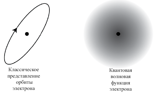В отличие от ситуации с классической механикой, где состояние системы можно описать в контексте ее координаты и скорости, природа квантовой системы куда менее конкретна. Рассмотрим электрон в его «естественной среде обитания», то есть когда он обращается вокруг атомного ядра. При слове «обращается» вы, вероятно, вспомните одно из тех наглядных пособий, которые, несомненно, не раз вам попадались, где орбита электрона изображается более или менее похожей на планетарную орбиту в Солнечной системе. У электрона (могли бы подумать вы) есть координата, скорость, и с течением времени он носится вокруг ядра, расположенного в центре атома, по круговой или, может быть, эллиптической орбите.