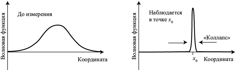 Все эти дополнительные правила связаны с измерением. Измеряя, например, спин или координату частицы, мы, согласно квантовой механике, в любом случае получим лишь определенные, возможные в данном случае результаты. Конкретный результат спрогнозировать не выйдет, но можно рассчитать вероятность получения каждого из возможных результатов. После того как измерение будет выполнено, волновая функция коллапсирует, превращаясь в совершенно новую функцию, в которой все вероятности сконцентрированы вокруг именно того результата, который вы только что получили. Таким образом, измеряя квантовую систему, максимум, на что вы можете рассчитывать — это возможность спрогнозировать вероятность различных ее результатов. Но если вы сразу повторите измерение той же самой величины, то раз за разом будете получать один и тот же результат — волновая функция сколлапсировала в него.