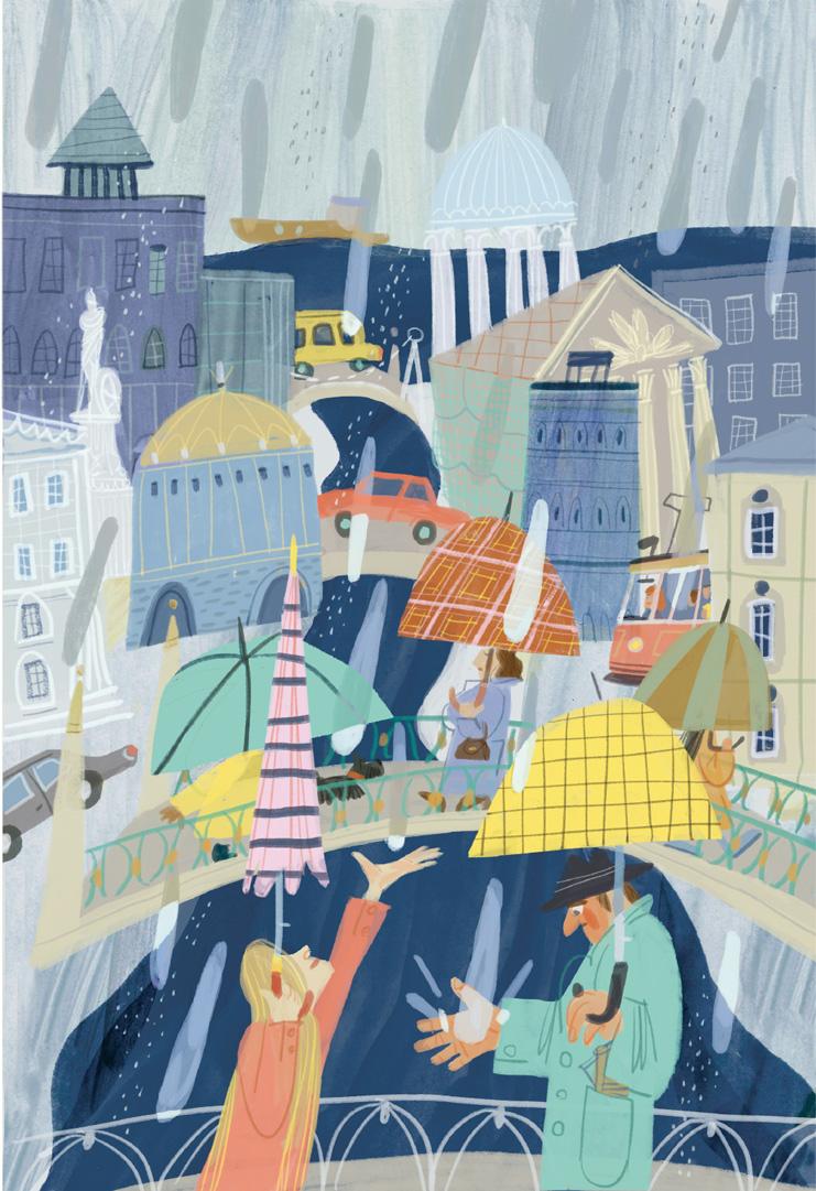 На севере, на берегу широкой реки расположился большой город. В нём много красивых старинных домов, нарядных набережных и не сосчитать сколько мостов. А ещё в нём живёт пасмурная погода. Горожане только и делают, что открывают-закрывают зонтики, вздыхают и говорят друг другу: