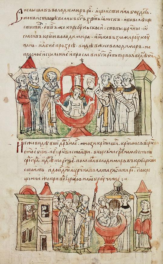 Крещение Владимира и его дружины. Миниатюра из Радзивилловской летописи. XV в.