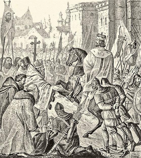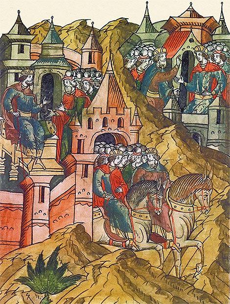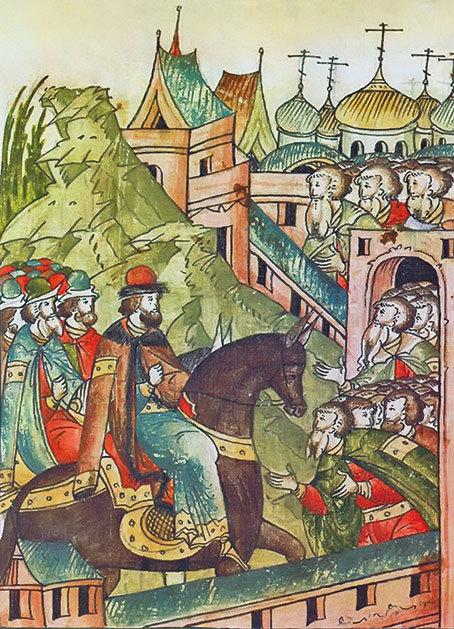Владимир Всеволодович Мономах прибывает в Киев на престол отца и деда в 1113 г. Миниатюра Лицевого летописного свода. XVI в.