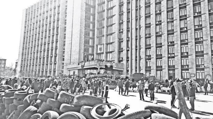 Центральный вход в здание Донецкого управления СБУ после его захвата восставшими дончанами