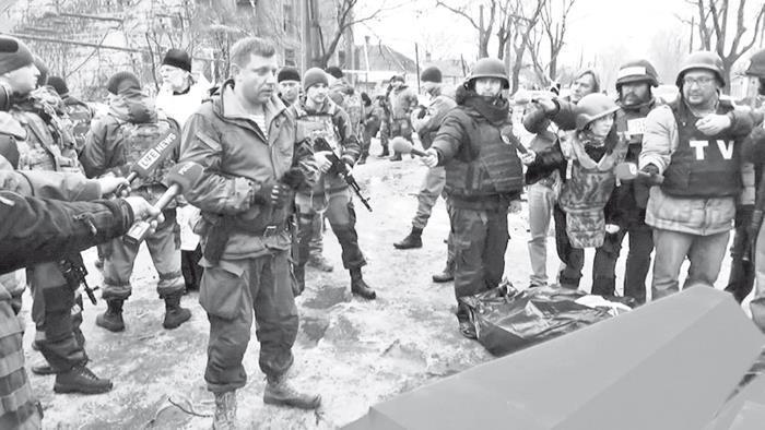 Александр Захарченко дает интервью возле Донецкого аэропорта перед выдачей тел украинских десантников представителям Украины. В это время со стороны Украины, предупрежденной заранее, начинается массированный артобстрел