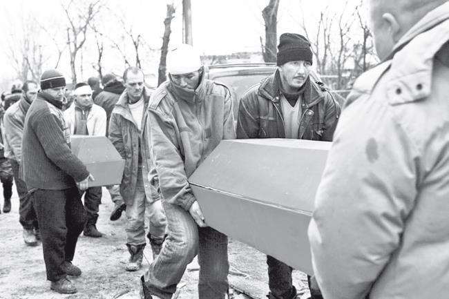 Украинские пленные военнослужащие переносят гробы с телами своих товарищей, которые передаются украинской стороне. Часть этих пленных в тот же день решением Александра Захарченко без каких-либо условий будет передана их родителям под гарантии, что воевать они больше не будут