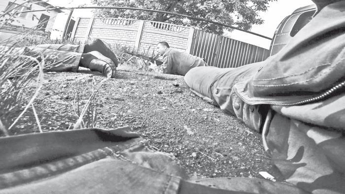 Момент боя в Донецком аэропорту 26 мая 2014 года. На земле под обстрелом с автоматом премьер-министр Александр Бородай. Съемку ведет его помощник Сергей Кавтарадзе