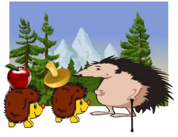 Видят ежики, на пенечке дедушка еж сидит. На палку-трость опирается.