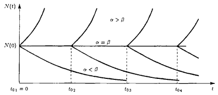 Изменение численности популяции со временем в модели Мальтуса (α — рождаемость; β — смертность)