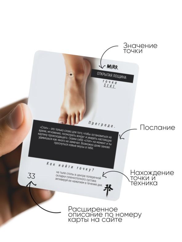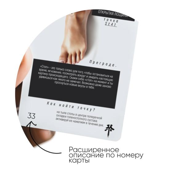 Прочитайте послание на карте. Пусть это будет не просто текст, а возможность на мгновение остановиться и услышать себя. Позвольте себе осознать и почувствовать каждое слово, и понять, с чем вам нужно работать. Воздействуйте на точку. Следуя указаниям на карте, уделите внимание точке на теле, массируя ее в течение нескольких минут. Это поможет вам снять физическое напряжение и освободить тело от накопившихся блоков. Чувствуйте изменения. После работы с картой обратите внимание на ощущения в теле и эмоциях. Возможно, вы почувствуете облегчение, расслабление и восстановление энергии.