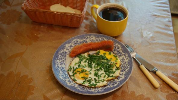 4. Когда через две-три минуты белок уплотнится, выложить глазунью на тарелку к предварительно освобожденному от костей куску рыбы.
