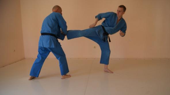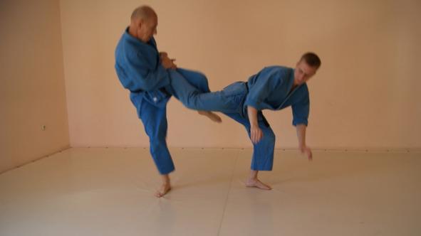 Этот прием хапкидо можно применять против бокового (хорошо) и прямого (неплохо) удара в тех случаях, как удается захватить и приподнять ногу противника.