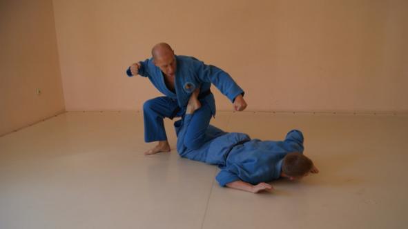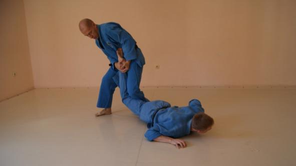 поднимая захваченную стопу, левым коленом давить на колено противника пока он не упадет на пол лицом вниз.