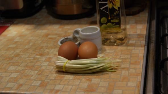 Понадобиться: масло растительное, два куриных яйца, небольшой пучок черемши, перец черный острый, соль