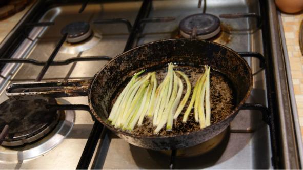 2. Зеленый лук порезать, белые части стеблей высыпать в масло.