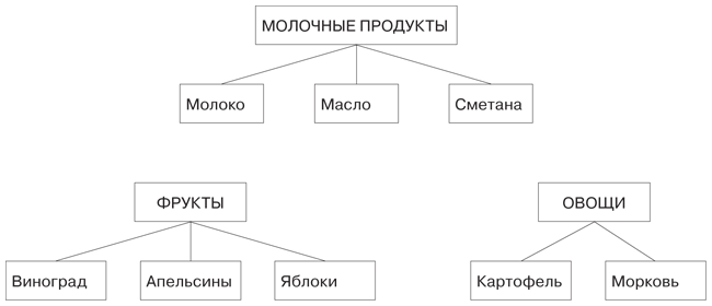 Безусловно, недостаточно просто разбить предметы на группы, не установив для себя их взаимосвязи. Смысл группировки состоял не просто в разделении восьми предметов на группы по несколько предметов в каждой, а в получении трех обобщающих категорий: молочные продукты, фрукты и овощи.