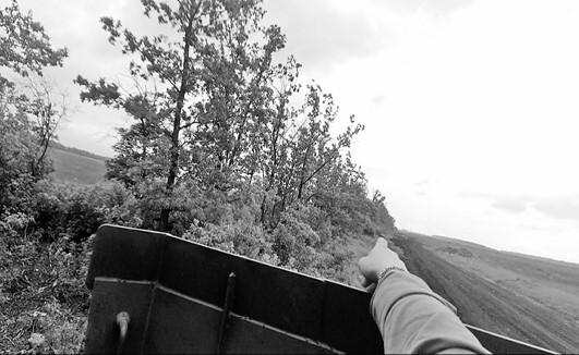 Из укромного места выкатывается трофейный бронеавтомобиль. В сравнении с нашим стареньким японским пикапом он выглядит скорее как огромный грузовик. Снова где-то недалеко громыхнуло. Сопровождающий офицер поторапливает: «Давайте быстро в машину и поедем, мы не в самом тихом месте». Забираемся в туловище этого кита на колесах. Сиденья неширокие и жесткие, окна-бойницы предназначены явно не для любования пейзажами. Решаюсь поснимать сверху на специальную камеру, закрепленную у меня на виске – такие кадры получаются самыми динамичными. «Козака» нещадно трясет на проселочной дороге, я изо всех всех сил упираюсь ногами в лестницу люка, чтобы не потерять равновесие, за щиколотки меня придерживают военные. Вокруг полуразрушенные здания, следы продолжающихся боев. Кадры получаются атмосферные.
