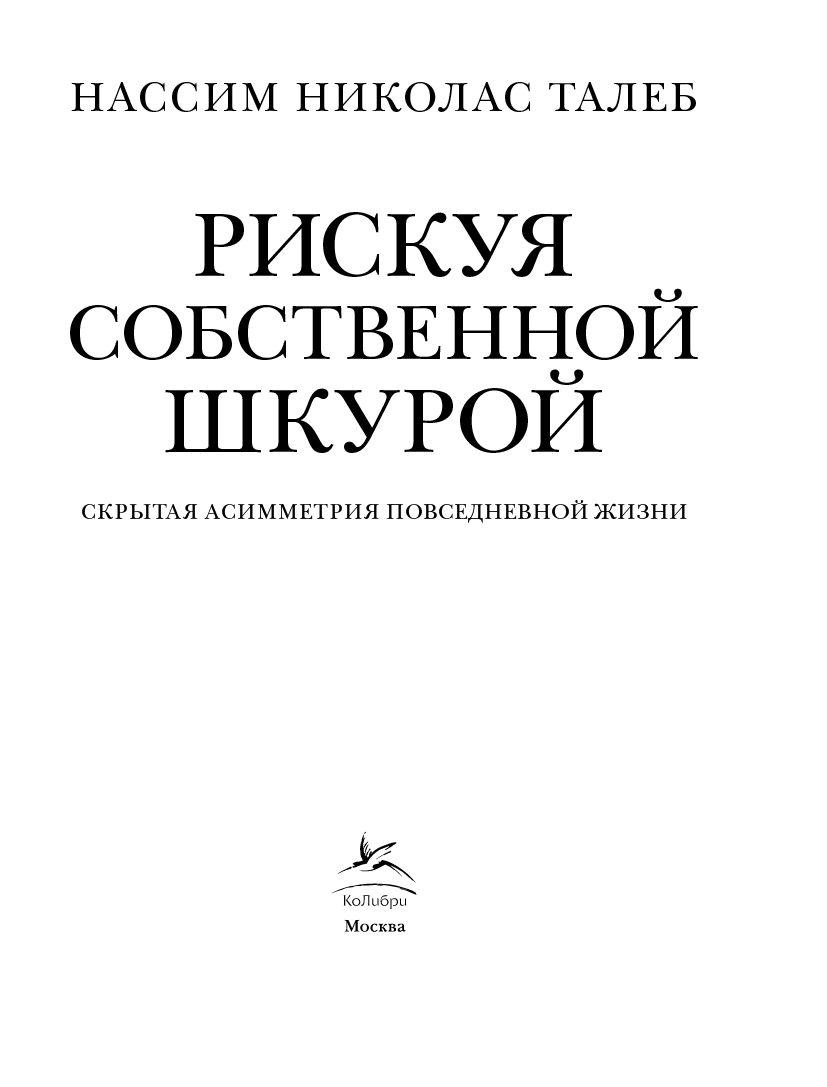 Более точный (хотя и менее удачный) заголовок книги был бы таким: «Не столь очевидные аспекты шкуры на кону: скрытые асимметрии и их последствия». Я не люблю читать книги, которые рассказывают об очевидном. Я люблю, когда меня удивляют. В соответствии с принципом взаимной выгоды в стиле «своя шкура на кону» я не приглашаю читателя в скучное и предсказуемое странствие по университетским лекциям — а скорее зову в путешествие, которое понравилось бы мне самому.