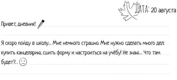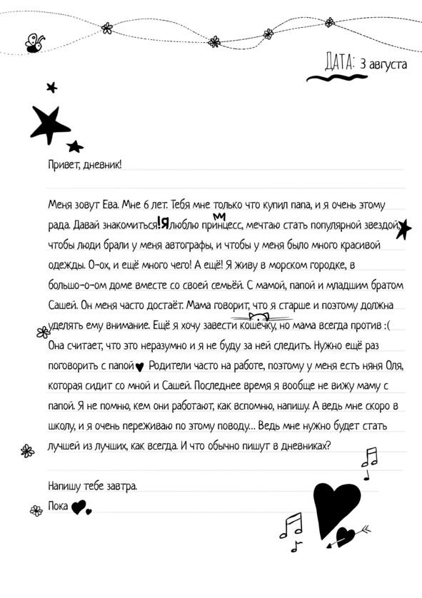 Когда я услышала, что есть такая штука — личный дневник, сразу захотела себе нечто подобное. Ведь во всех фильмах, которые я смотрела, у всех девочек были дневники. И папа по доброте душевной купил мне такой. Розовый. Пушистый. Со стразами. Красота! К нему не хватало ещё блестящей ручки с перьями на конце, но папа быстро исправил ситуацию.