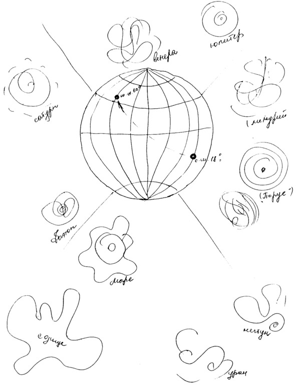 <…> «Это убеждение мое (об Универсальном Знании) нашло себе подтверждение, когда я встретился с русскими, тайно хранившими в Костромской губернии Традицию (Дюн Хор). Эти люди значительно старше меня по возрасту и, насколько я могу оценить, более меня компетентные в самой Универсальной науке и в оценке современного международного положения. Выйдя из костромских лесов в форме простых юродивых (нищих), якобы безвредных помешанных, они проникли в Москву и отыскали меня <…> Посланный от этих людей под видом сумасшедшего произносил на площадях проповеди, которых никто не понимал, и привлекал внимание людей странным костюмом и идеограммами, которые он с собой носил. <…> Этого посланного — крестьянина Михаила Круглова — несколько раз арестовывали, сажали в ГПУ, в сумасшедшие дома. Наконец, пришли к заключению, что он безвредный. Отпустили его на волю и больше не преследуют. В конце концов, с его идеограммами встретился в Москве и я, который мог читать и понимать их значение.