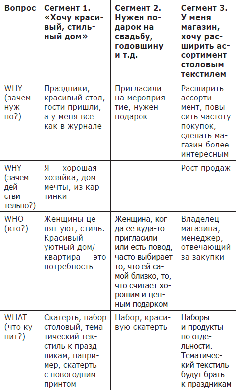 Метод Шеррингтона – он же «метод 6W» – позволяет разбить всех-всех, кто может купить, на четкие сегменты, увидеть разные мотивы для покупки, то, что для разных сегментов могут быть нужны разные продукты и разные каналы продаж и продвижения.