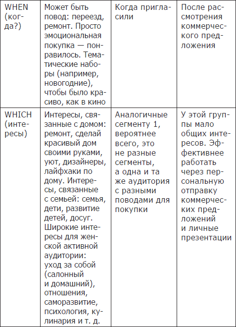 Причем многие в качестве отдельной аудитории выделяют тех, кто покупает товар в подарок, но, проведя сегментацию, мы видим, что это деление излишне. Это все сегмент 1, «Красивый, уютный дом», просто с другим поводом для покупки.