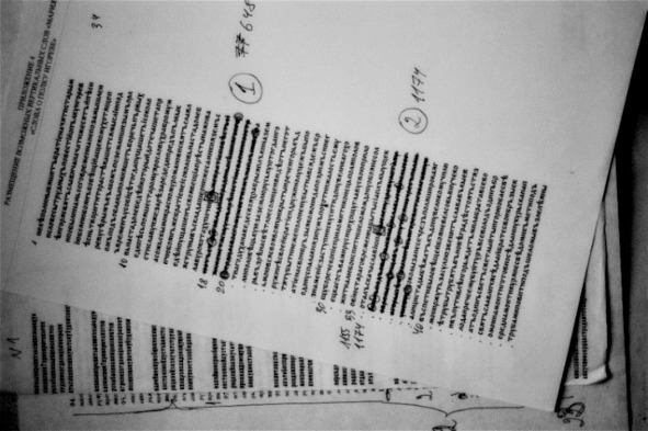 …Когда я взглянул, как располагаются первые выходящие из работающего принтера группы вариантов, то я был поражен удивительной равномерностью их расположения. Я поэтому сразу же предположил, что это — страницы первоначальной рукописи. Я посмотрел на календарь и часы. Было 23 апреля 1998 года, 16 часов 10 минут.