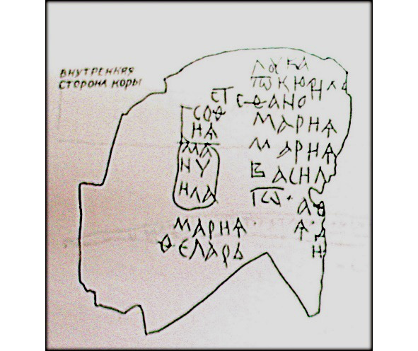 Я решил поискать, как писалось имя Мария в старых текстах. Открыл книгу В.Л.Янина «Я послал тебе бересту», и сразу нашел нужную берестяную грамоту. Очевидно, это был план иконы. Имя Мария написано несколько раз как раз в том написании, как на «акростихах»!