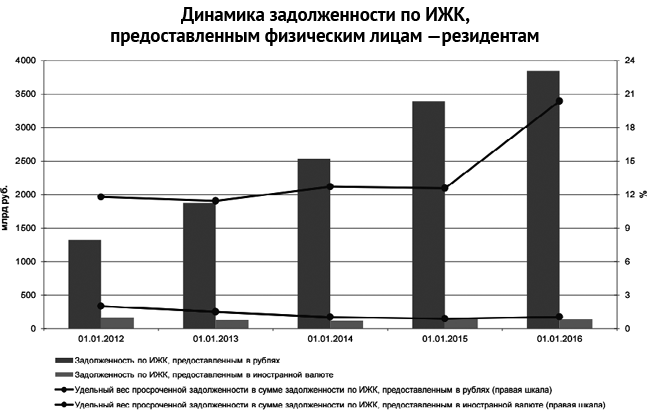 В подтверждение этого необходимо отметить, что по состоянию на 2010 г. из 1,2 млн ипотечных заемщиков в России сложности с погашением испытывали около 85–90 тыс. (т. е. примерно 10 %49). В период кризиса в 2009 г. в просрочку попало около 15 % всех ипотечных заемщиков50. Данные за 2009–2010 гг. весьма показательны, ведь 2008–2009 гг. являлись кризисными и потому наглядно показали, что случается в такие годы с платежами по ипотеке. Если же говорить о сумме просроченной задолженности, то по данным ЦБ РФ, на начало 2016 г. на просрочке находилось около 20 % всей задолженности по ипотечным кредитам51: