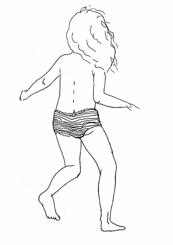 Сижу я в детской спальне, у входа, на маленькой кроватке. В большой комнате четыре ряда по пять аккуратно заправленных кроватей. Полумрак. И от меня весело, как бы играя, убегает ребёнок. Вижу спинку, светлые волосики, не по размеру большие трусики чуть ниже талии…