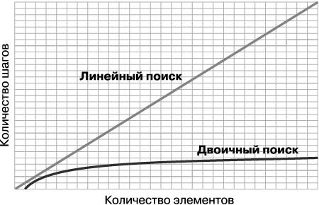 С другой стороны, при бинарном поиске по мере увеличения объема данных количество шагов алгоритма увеличивается незначительно. Это вполне сочетается с тем, что мы уже знаем: удвоение числа элементов массива добавляет в алгоритм двоичного поиска всего один шаг.