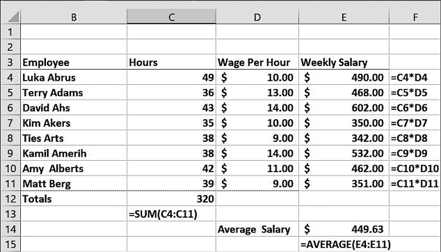 Кроме того, вы можете вычислить в ячейке C12 (вы можете это увидеть в файле Wagesfinal.xlsx) общую сумму отработанных часов за неделю с помощью формулы =SUM(C4:C11). В ячейке E14 я вычислил среднюю зарплату работника по формуле =СРЗНАЧ(E4:E11) .