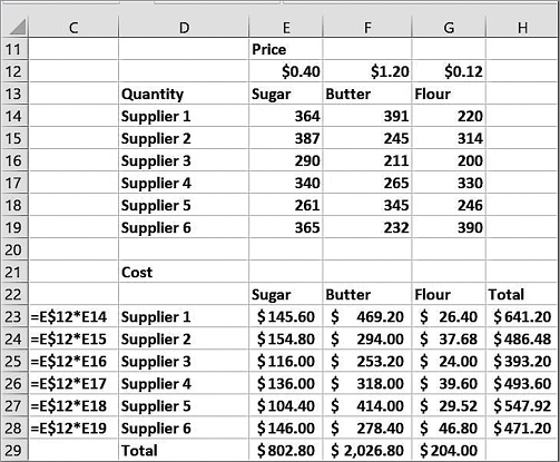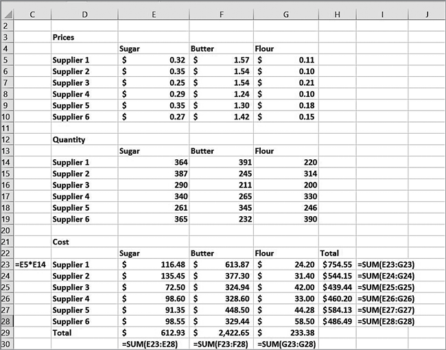 Как показано на рис. 1.2, в ячейке E23 мы вычисляем сумму, выплаченную за сахар поставщику Supplier 1, умножая стоимость фунта сахара, запрошенную Supplier 1, на количество сахара, закупленного у этого поставщика. Для этого мы используем формулу =E5*E14.