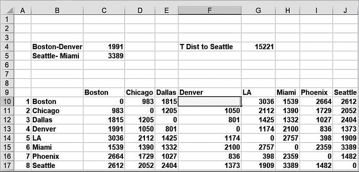 В первой формуле суммируются числа в восьмой строке (строка 17) массива Distances; во второй формуле суммируются числа в восьмом столбце (столбец J) массива Distances. И в том, и в другом случае суммарное расстояние от Сиэтла до других городов и от этих городов до Сиэтла составляет 15 221 миль (см. рис. 4.1).