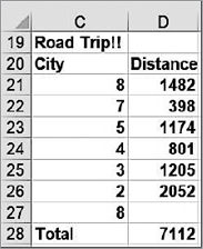 Представьте, что футбольная команда из Сиэтла отправляется в турне, в котором они проводят игры в Финиксе, Лос-Анджелесе, Денвере, Далласе и Чикаго. В конце выездной серии игр команда возвращается в Сиэтл. Легко ли подсчитать, сколько миль они проедут в течение турне? Как показано на рис. 4.2, следует просто перечислить города в порядке посещения (8-7-5-4-3-2-8), начиная и заканчивая Сиэтлом, и скопировать формулу =ИНДЕКС(distances;C21;C22) в ячейки с D21 по D26. Формула в ячейке D21 определяет расстояние между Сиэтлом и Финиксом (город номер 7), формула в ячейке D22 — расстояние между Финиксом и Лос-Анджелесом и т.д. Всего команда проедет 7112 миль. И просто забавы ради покажите с помощью функции ИНДЕКС, что команда «Майами Хит» путешествует за сезон больше любой другой команды НБА.