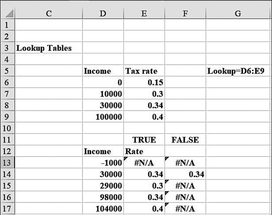 В F13:F17 я изменил значение аргумента интервальный_просмотр с ИСТИНА на ЛОЖЬ, и скопировал из ячейки F13 в F14:F17 формулу =ВПР(D13;Lookup;2;ЛОЖЬ). Ячейка F14 по-прежнему содержит налоговую ставку 34%, поскольку в первом столбце таблицы имеется точное совпадение — 30000. Во всех других ячейках F13:F17 Excel выдал ошибку #Н/Д, поскольку уровни дохода в этих ячейках не имеют точного совпадения в первом столбце таблицы.
