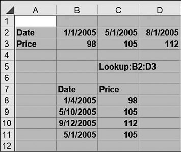 Я скопировал формулу =ГПР(B8,lookup,2,ИСТИНА) из C8 в C9:C11. Формула пытается сравнить даты из столбца B с первой строкой диапазона B2:D3. Для любой даты между 01.01.05 и 30.04.05 функция поиска выбирает 01.01.05 и возвращает значение цены из B3; для любой даты между 01.05.05 и 31.07.05 функция поиска выбирает 1 мая и возвращает значение цены из C3; и для любой даты после 01.08.05 выбирается 1 августа и возвращается значение цены из D3.