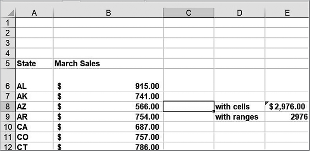 Чтобы найти сумму, выплаченную каждому из поставщиков, введите в H23 формулу =СУММ(E23:G23) и скопируйте эту формулу в H24:H28. Введя формулу =СУММ(E23:E28) в ячейку E29 и скопировав эту формулу в F29:H29, вы получите общую сумму, выплаченную за каждый продукт.