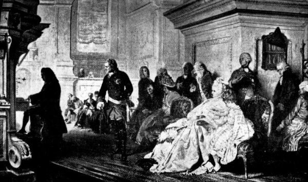 Bach performing at the newly invented pianoforte for Frederick the Great during his visit to the court in 1747—an event which Bach regarded as one of most notable episodes in his career.