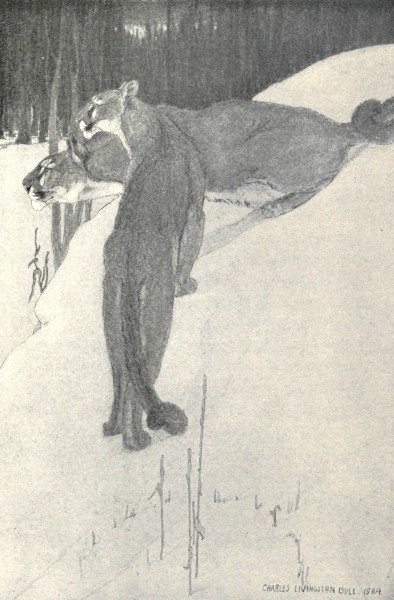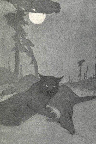 Late in the morning, when pasturing was over for the time, the ram and the little ewe lay down in the shade of a steep rock, comfortably chewing their cud, while the lamb slept at its mother's side. The ram, deeply contented, did not observe two gray-brown, stealthy forms creeping along the slope, from bush to rock, and from stump to hillock. But the ewe, ever on the watch, presently caught sight of them, and sprang to her feet with a snort of terror. She knew well enough what a lynx was. Yet for all her terror she had no thought of flight. Her lamb was too young to flee, and she would stay by it in face of any fate.