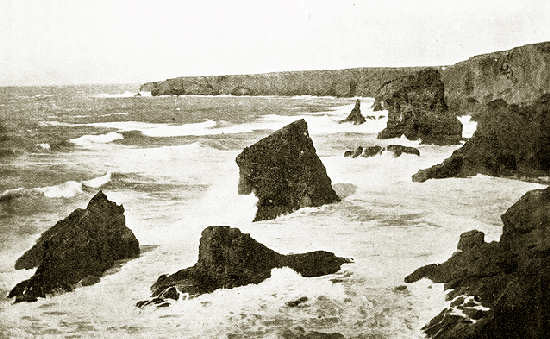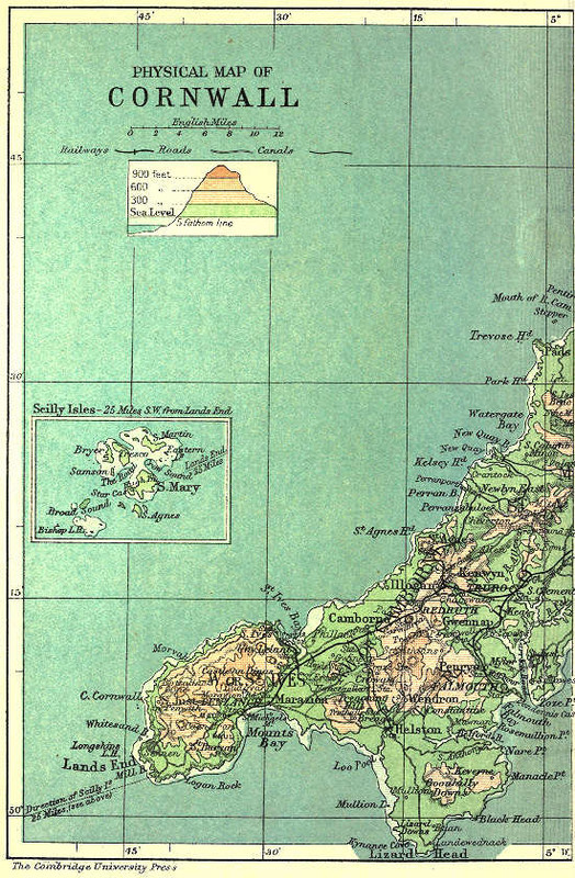 St Just in Penwith (5646), a market town seven miles west of Penzance, the nearest railway station. The town consists of several streets diverging from a triangular space in the centre. The church, well cared for, is Perpendicular in style. (pp. 40, 110, 111.)