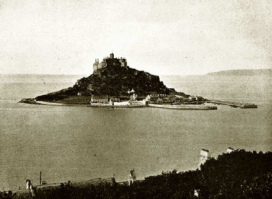 Marazion (1252) or Market Jew derives its name from a Thursday market there held. In ancient times the place was supported by the pilgrims resorting to St Michael's Mount. The town was pillaged by the French in the reign of Henry VIII. From Marazion St Michael's Mount is reached. At the base of the Mount lies a fishing village of 38 houses, and a little harbour. From the sea the hill rises to a height of 230 ft., the body of the island is granite but its north base is of slate. The castle is the property of Lord St Levan. Marazion is a station on the G.W.R. (pp. 9, 44, 45, 96.)