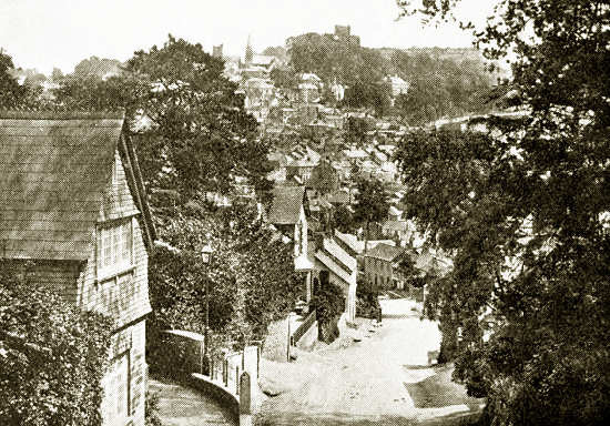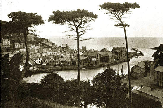 Looe (2588) is composed of two towns, East Looe and West Looe, separated by a creek and united by a long bridge. East Looe was formerly a borough returning two members. It is the terminus of a branch line of the G.W.R. There is a good tidal harbour, to which vessels of large tonnage can be brought up for the shipment of ore and granite, conveyed thither from Caradon and the Cheesewring, and thence coal is conveyed to Liskeard and its neighbourhood. The old town hall is a picturesque building. West Looe was also originally a borough returning two members. (pp. 31, 49, 50, 92, 105, 131, 135, 138, 143.)