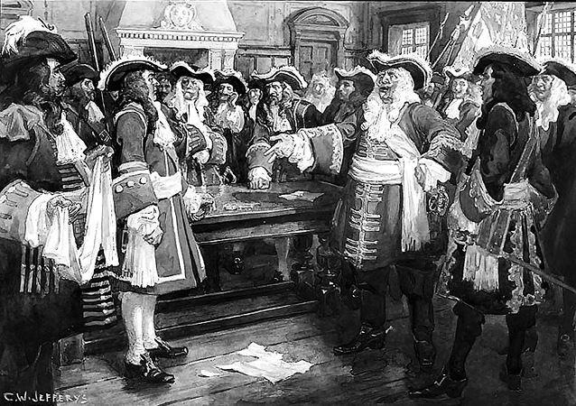 Граф де Фронтенак принимает британского посланникаУильяма Фипса с требованием о капитуляции Квебека. Худ. Чарльз Уильям Джефрис (1925)
