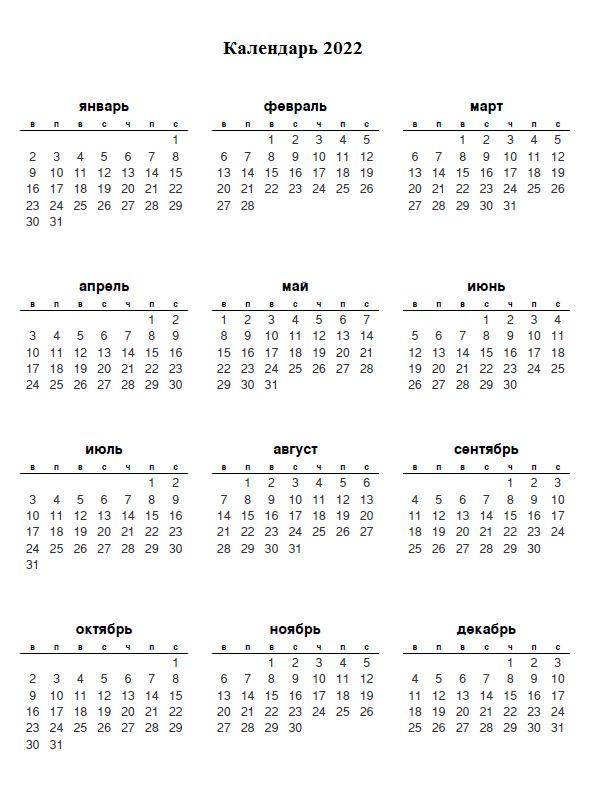 Календарь на 2022 год с началом недели в воскресенье