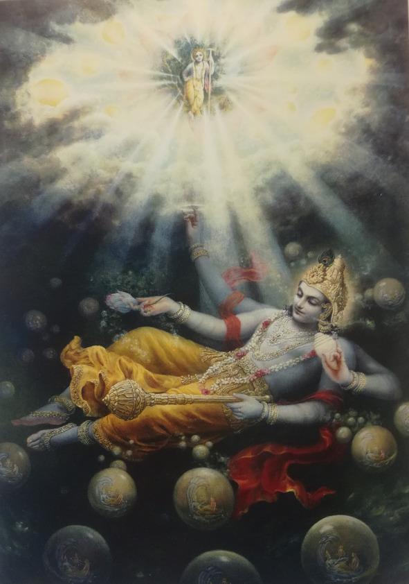 Маха-Вишну возлежит на водах Причинного океана, из пор на коже которого выходят миллионы материал