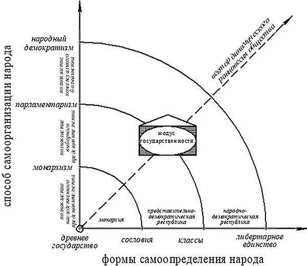 Социально-политический строй представляет собой публично-правовой уклад, устойчивые отношения, сложившиеся внутри общества между его базисом и политическим представительством, порядок, подкрепленный правоустановлениями и публичной властью. В упомянутой схеме такой уклад емко выражен одним термином: монархизм, парламентаризм и народный демократизм. Каждый из них соответствует собственной социальной структуре. Монархизм неотделим от сословного общества, парламентаризм от классового, народный демократизм формируется на базе всеобщего равенства людей в политических правах и действиях. История неопровержимо доказывает: модус государственности неуклонно движется вверх, придерживаясь незыблемого вектора самосохранения общества (динамического равновесия), и это равновесие обеспечивается общественным сознанием, базирующимся на эпохальных представлениях людей о свободе, равенстве и справедливости. Соответственно, каждому строю свойственна своя форма государства: монархия, представительно-демократическая и народно-демократическая республика. Все иные известные науке формы соотносятся с вышеуказанными формами как с родовыми объектами. Научно хитрить не получится. Формальная логика неумолима.