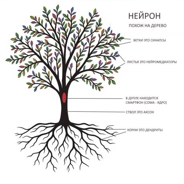 Чтобы проще понять, представьте нейрон как дерево. У него есть корни, ствол, ветви и листья. Корни — это дендриты, через которые информация поступает в дерево (нейрон). Ствол — это аксон, который соединяет дерево с другими деревьями (нейронами) или с органами тела. Ветви — это синапсы, узлы связи между деревьями (нейронами), а листья — нейромедиаторы, которые передают сигнал через синапс. Ну, а если представить, что у дерева есть смартфон, то это будет сома, то есть ядро нейрона, которое отвечает за поддержание всех жизненных функций.
