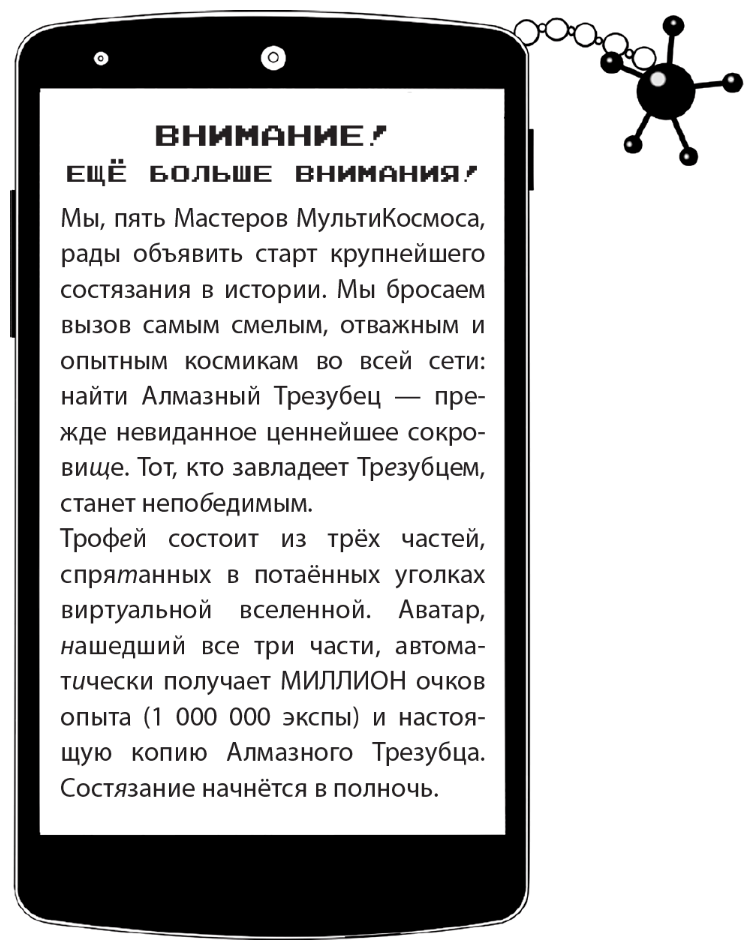 «…крупнейшее состязание в истории виртуальных игр, – говорит радиоведущий. – Счётчик пользователей, подключённых к МультиКосмосу в данный момент, приближается к 680 миллионам. Это в пять раз больше обычного. Причина – таинственный Алмазный Трезубец, который может быть спрятан в любом уголке му