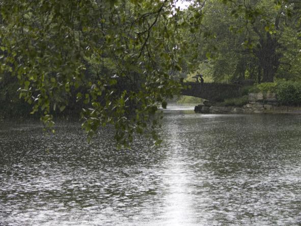 Тот дождь, которого так ожидала замершая природа, начался с крупных капель, через минуту перейдя в сплошной мелкий ливень. Природа словно проснулась, ожила; зашумели листья деревьев с легким ветерком, скосившим струи дождя. Раздавались голоса птиц, не успевших укрыться и перелетавших с полянок под сень листвы. Под шумом струй чувствовалась некоторая радость теплому летнему дождику.