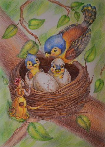 Птичка снесла три хорошеньких пестрых яйца. Затем из яичек вылупились крошечные слепые птенчики.