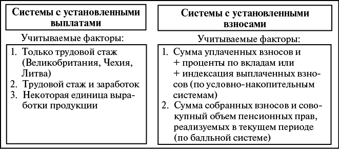 Это, как правило, государственные пенсионные системы, в которых заранее устанавливается уровень пенсий (отсюда термин «с фиксированными размерами»), зависящий от заработков и продолжительности страхового стажа, что подразумевает отсутствие на индивидуальном уровне жесткой актуарной зависимости между объемом внесенных взносов и размерами пенсий14.
